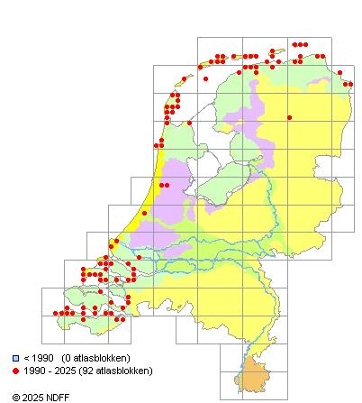 Het aantal atlasblokken (5x5 km) waarin de soort is gemeld binnen een periode van vijf jaar (vanaf 1980) of twintig jaar. Niet gecorrigeerd voor waarnemersinspanning en het aantal doorgegeven waarnemingen kan sterk variëren per periode, dus een trend in verspreiding kan hier niet direct uit worden afgelezen. Het opgegeven jaartal is het eerste jaar van de periode. Bron: gevalideerde waarnemingen uit de NDFF.
