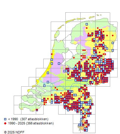 Het aantal atlasblokken (5x5 km) waarin de soort is gemeld binnen een periode van vijf jaar (vanaf 1980) of twintig jaar. Niet gecorrigeerd voor waarnemersinspanning en het aantal doorgegeven waarnemingen kan sterk variëren per periode, dus een trend in verspreiding kan hier niet direct uit worden afgelezen. Het opgegeven jaartal is het eerste jaar van de periode. Bron: gevalideerde waarnemingen uit de NDFF.
