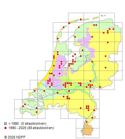Het aantal atlasblokken (5x5 km) waarin de soort is gemeld binnen een periode van vijf jaar (vanaf 1980) of twintig jaar. Niet gecorrigeerd voor waarnemersinspanning en het aantal doorgegeven waarnemingen kan sterk variëren per periode, dus een trend in verspreiding kan hier niet direct uit worden afgelezen. Het opgegeven jaartal is het eerste jaar van de periode. Bron: gevalideerde waarnemingen uit de NDFF.