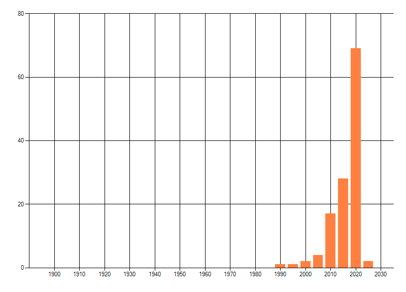 Het aantal atlasblokken (5x5 km) waarin de soort is gemeld binnen een periode van vijf jaar (vanaf 1980) of twintig jaar. Niet gecorrigeerd voor waarnemersinspanning en het aantal doorgegeven waarnemingen kan sterk variëren per periode, dus een trend in verspreiding kan hier niet direct uit worden afgelezen. Het opgegeven jaartal is het eerste jaar van de periode. Bron: gevalideerde waarnemingen uit de NDFF.
