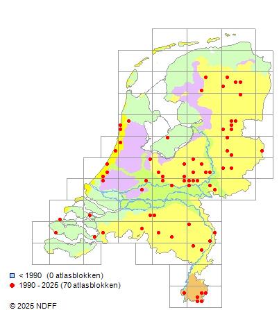 Het aantal atlasblokken (5x5 km) waarin de soort is gemeld binnen een periode van vijf jaar (vanaf 1980) of twintig jaar. Niet gecorrigeerd voor waarnemersinspanning en het aantal doorgegeven waarnemingen kan sterk variëren per periode, dus een trend in verspreiding kan hier niet direct uit worden afgelezen. Het opgegeven jaartal is het eerste jaar van de periode. Bron: gevalideerde waarnemingen uit de NDFF.