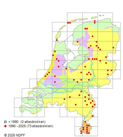 Het aantal atlasblokken (5x5 km) waarin de soort is gemeld binnen een periode van vijf jaar (vanaf 1980) of twintig jaar. Niet gecorrigeerd voor waarnemersinspanning en het aantal doorgegeven waarnemingen kan sterk variëren per periode, dus een trend in verspreiding kan hier niet direct uit worden afgelezen. Het opgegeven jaartal is het eerste jaar van de periode. Bron: gevalideerde waarnemingen uit de NDFF.