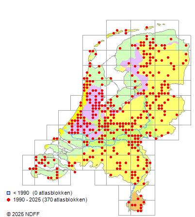 Het aantal atlasblokken (5x5 km) waarin de soort is gemeld binnen een periode van vijf jaar (vanaf 1980) of twintig jaar. Niet gecorrigeerd voor waarnemersinspanning en het aantal doorgegeven waarnemingen kan sterk variëren per periode, dus een trend in verspreiding kan hier niet direct uit worden afgelezen. Het opgegeven jaartal is het eerste jaar van de periode. Bron: gevalideerde waarnemingen uit de NDFF.