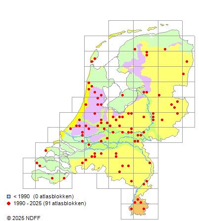Het aantal atlasblokken (5x5 km) waarin de soort is gemeld binnen een periode van vijf jaar (vanaf 1980) of twintig jaar. Niet gecorrigeerd voor waarnemersinspanning en het aantal doorgegeven waarnemingen kan sterk variëren per periode, dus een trend in verspreiding kan hier niet direct uit worden afgelezen. Het opgegeven jaartal is het eerste jaar van de periode. Bron: gevalideerde waarnemingen uit de NDFF.