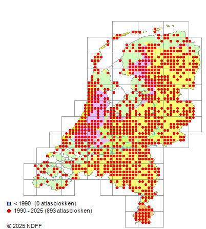 Het aantal atlasblokken (5x5 km) waarin de soort is gemeld binnen een periode van vijf jaar (vanaf 1980) of twintig jaar. Niet gecorrigeerd voor waarnemersinspanning en het aantal doorgegeven waarnemingen kan sterk variëren per periode, dus een trend in verspreiding kan hier niet direct uit worden afgelezen. Het opgegeven jaartal is het eerste jaar van de periode. Bron: gevalideerde waarnemingen uit de NDFF.