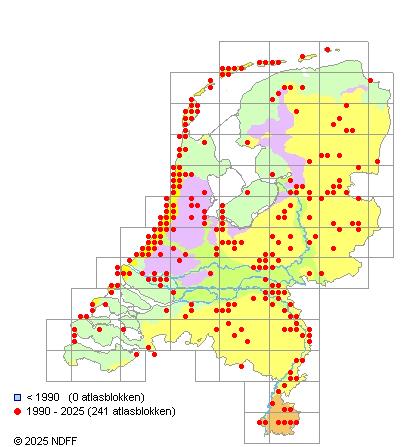 Het aantal atlasblokken (5x5 km) waarin de soort is gemeld binnen een periode van vijf jaar (vanaf 1980) of twintig jaar. Niet gecorrigeerd voor waarnemersinspanning en het aantal doorgegeven waarnemingen kan sterk variëren per periode, dus een trend in verspreiding kan hier niet direct uit worden afgelezen. Het opgegeven jaartal is het eerste jaar van de periode. Bron: gevalideerde waarnemingen uit de NDFF.