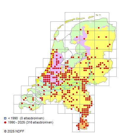 Het aantal atlasblokken (5x5 km) waarin de soort is gemeld binnen een periode van vijf jaar (vanaf 1980) of twintig jaar. Niet gecorrigeerd voor waarnemersinspanning en het aantal doorgegeven waarnemingen kan sterk variëren per periode, dus een trend in verspreiding kan hier niet direct uit worden afgelezen. Het opgegeven jaartal is het eerste jaar van de periode. Bron: gevalideerde waarnemingen uit de NDFF.