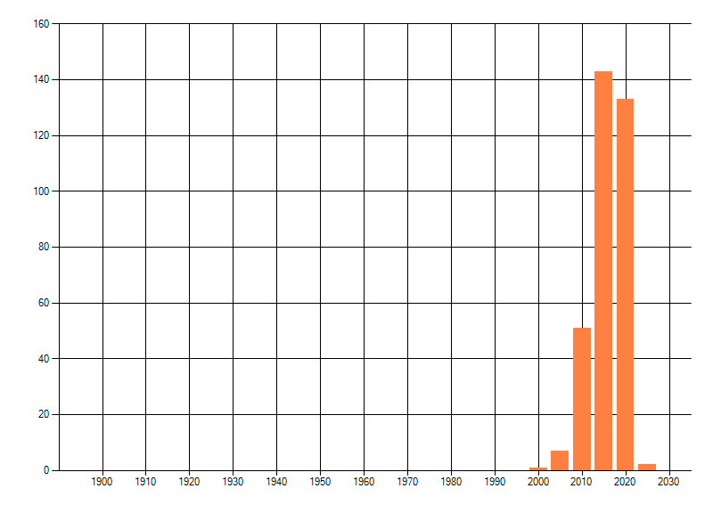 Het aantal atlasblokken (5x5 km) waarin de soort is gemeld binnen een periode van vijf jaar (vanaf 1980) of twintig jaar. Niet gecorrigeerd voor waarnemersinspanning en het aantal doorgegeven waarnemingen kan sterk variëren per periode, dus een trend in verspreiding kan hier niet direct uit worden afgelezen. Het opgegeven jaartal is het eerste jaar van de periode. Bron: gevalideerde waarnemingen uit de NDFF.