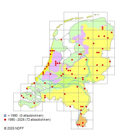 Het aantal atlasblokken (5x5 km) waarin de soort is gemeld binnen een periode van vijf jaar (vanaf 1980) of twintig jaar. Niet gecorrigeerd voor waarnemersinspanning en het aantal doorgegeven waarnemingen kan sterk variëren per periode, dus een trend in verspreiding kan hier niet direct uit worden afgelezen. Het opgegeven jaartal is het eerste jaar van de periode. Bron: gevalideerde waarnemingen uit de NDFF.