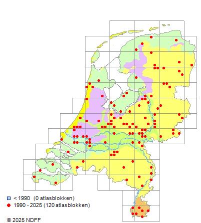 Het aantal atlasblokken (5x5 km) waarin de soort is gemeld binnen een periode van vijf jaar (vanaf 1980) of twintig jaar. Niet gecorrigeerd voor waarnemersinspanning en het aantal doorgegeven waarnemingen kan sterk variëren per periode, dus een trend in verspreiding kan hier niet direct uit worden afgelezen. Het opgegeven jaartal is het eerste jaar van de periode. Bron: gevalideerde waarnemingen uit de NDFF.
