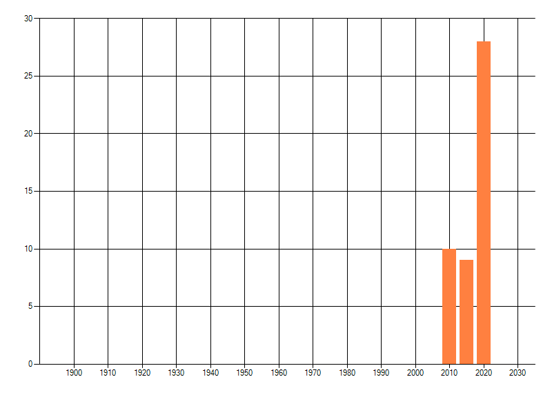 Het aantal atlasblokken (5x5 km) waarin de soort is gemeld binnen een periode van vijf jaar (vanaf 1980) of twintig jaar. Niet gecorrigeerd voor waarnemersinspanning en het aantal doorgegeven waarnemingen kan sterk variëren per periode, dus een trend in verspreiding kan hier niet direct uit worden afgelezen. Het opgegeven jaartal is het eerste jaar van de periode. Bron: gevalideerde waarnemingen uit de NDFF.