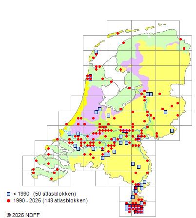 Het aantal atlasblokken (5x5 km) waarin de soort is gemeld binnen een periode van vijf jaar (vanaf 1980) of twintig jaar. Niet gecorrigeerd voor waarnemersinspanning en het aantal doorgegeven waarnemingen kan sterk variëren per periode, dus een trend in verspreiding kan hier niet direct uit worden afgelezen. Het opgegeven jaartal is het eerste jaar van de periode. Bron: gevalideerde waarnemingen uit de NDFF.