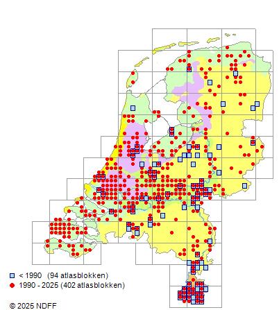 Het aantal atlasblokken (5x5 km) waarin de soort is gemeld binnen een periode van vijf jaar (vanaf 1980) of twintig jaar. Niet gecorrigeerd voor waarnemersinspanning en het aantal doorgegeven waarnemingen kan sterk variëren per periode, dus een trend in verspreiding kan hier niet direct uit worden afgelezen. Het opgegeven jaartal is het eerste jaar van de periode. Bron: gevalideerde waarnemingen uit de NDFF.