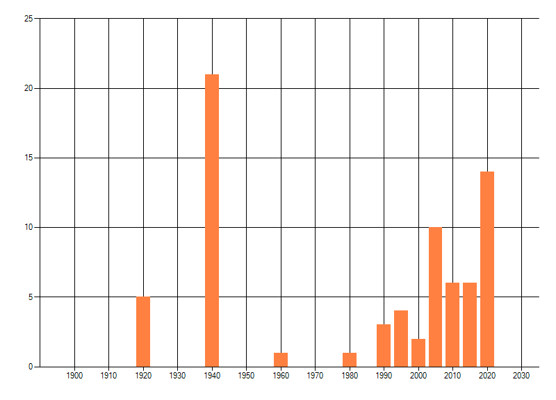Het aantal atlasblokken (5x5 km) waarin de soort is gemeld binnen een periode van vijf jaar (vanaf 1980) of twintig jaar. Niet gecorrigeerd voor waarnemersinspanning en het aantal doorgegeven waarnemingen kan sterk variëren per periode, dus een trend in verspreiding kan hier niet direct uit worden afgelezen. Het opgegeven jaartal is het eerste jaar van de periode. Bron: gevalideerde waarnemingen uit de NDFF.