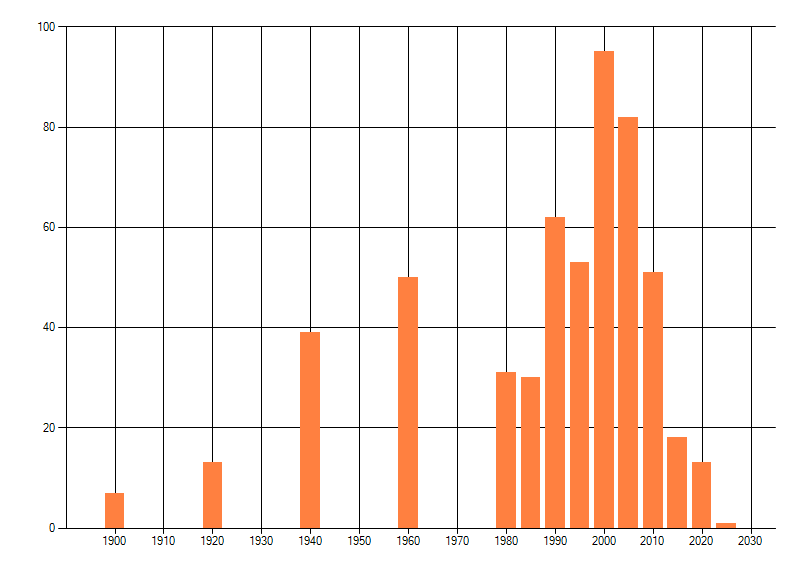 Het aantal atlasblokken (5x5 km) waarin de soort is gemeld binnen een periode van vijf jaar (vanaf 1980) of twintig jaar. Niet gecorrigeerd voor waarnemersinspanning en het aantal doorgegeven waarnemingen kan sterk variëren per periode, dus een trend in verspreiding kan hier niet direct uit worden afgelezen. Het opgegeven jaartal is het eerste jaar van de periode. Bron: gevalideerde waarnemingen uit de NDFF.