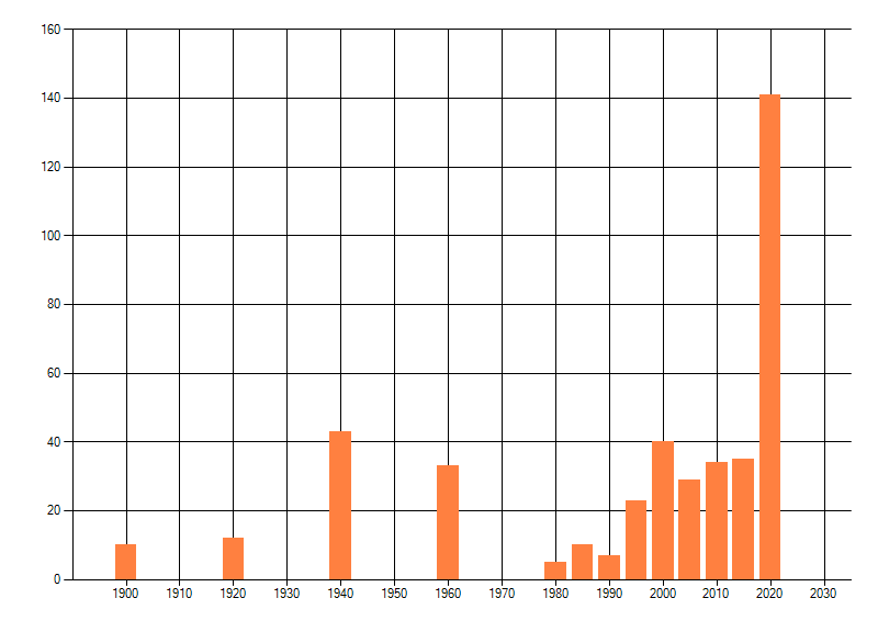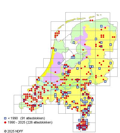 Het aantal atlasblokken (5x5 km) waarin de soort is gemeld binnen een periode van vijf jaar (vanaf 1980) of twintig jaar. Niet gecorrigeerd voor waarnemersinspanning en het aantal doorgegeven waarnemingen kan sterk variëren per periode, dus een trend in verspreiding kan hier niet direct uit worden afgelezen. Het opgegeven jaartal is het eerste jaar van de periode. Bron: gevalideerde waarnemingen uit de NDFF.