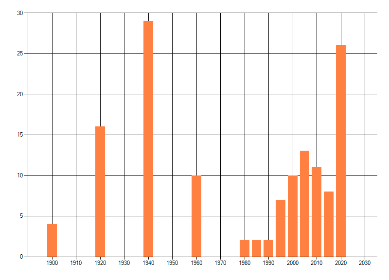 Het aantal atlasblokken (5x5 km) waarin de soort is gemeld binnen een periode van vijf jaar (vanaf 1980) of twintig jaar. Niet gecorrigeerd voor waarnemersinspanning en het aantal doorgegeven waarnemingen kan sterk variëren per periode, dus een trend in verspreiding kan hier niet direct uit worden afgelezen. Het opgegeven jaartal is het eerste jaar van de periode. Bron: gevalideerde waarnemingen uit de NDFF.