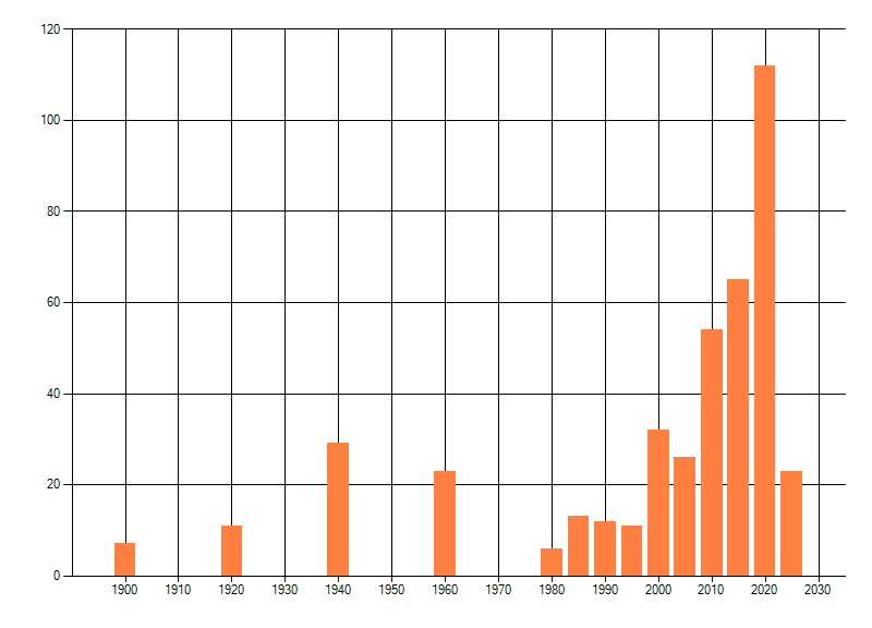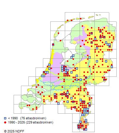 Het aantal atlasblokken (5x5 km) waarin de soort is gemeld binnen een periode van vijf jaar (vanaf 1980) of twintig jaar. Niet gecorrigeerd voor waarnemersinspanning en het aantal doorgegeven waarnemingen kan sterk variëren per periode, dus een trend in verspreiding kan hier niet direct uit worden afgelezen. Het opgegeven jaartal is het eerste jaar van de periode. Bron: gevalideerde waarnemingen uit de NDFF.