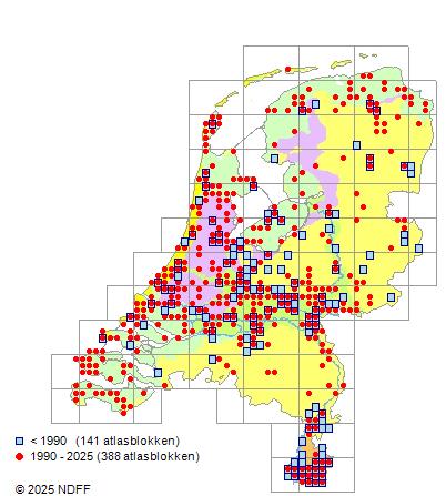 Het aantal atlasblokken (5x5 km) waarin de soort is gemeld binnen een periode van vijf jaar (vanaf 1980) of twintig jaar. Niet gecorrigeerd voor waarnemersinspanning en het aantal doorgegeven waarnemingen kan sterk variëren per periode, dus een trend in verspreiding kan hier niet direct uit worden afgelezen. Het opgegeven jaartal is het eerste jaar van de periode. Bron: gevalideerde waarnemingen uit de NDFF.