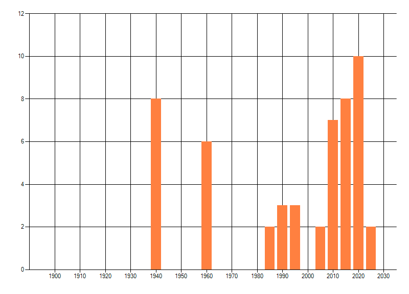 Het aantal atlasblokken (5x5 km) waarin de soort is gemeld binnen een periode van vijf jaar (vanaf 1980) of twintig jaar. Niet gecorrigeerd voor waarnemersinspanning en het aantal doorgegeven waarnemingen kan sterk variëren per periode, dus een trend in verspreiding kan hier niet direct uit worden afgelezen. Het opgegeven jaartal is het eerste jaar van de periode. Bron: gevalideerde waarnemingen uit de NDFF.