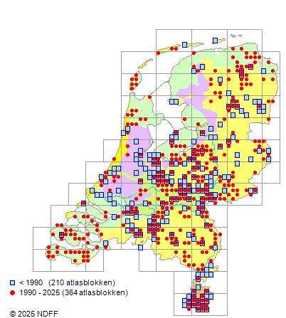 Het aantal atlasblokken (5x5 km) waarin de soort is gemeld binnen een periode van vijf jaar (vanaf 1980) of twintig jaar. Niet gecorrigeerd voor waarnemersinspanning en het aantal doorgegeven waarnemingen kan sterk variëren per periode, dus een trend in verspreiding kan hier niet direct uit worden afgelezen. Het opgegeven jaartal is het eerste jaar van de periode. Bron: gevalideerde waarnemingen uit de NDFF.