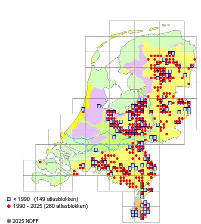 Het aantal atlasblokken (5x5 km) waarin de soort is gemeld binnen een periode van vijf jaar (vanaf 1980) of twintig jaar. Niet gecorrigeerd voor waarnemersinspanning en het aantal doorgegeven waarnemingen kan sterk variëren per periode, dus een trend in verspreiding kan hier niet direct uit worden afgelezen. Het opgegeven jaartal is het eerste jaar van de periode. Bron: gevalideerde waarnemingen uit de NDFF.