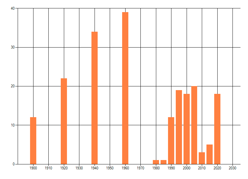 Het aantal atlasblokken (5x5 km) waarin de soort is gemeld binnen een periode van vijf jaar (vanaf 1980) of twintig jaar. Niet gecorrigeerd voor waarnemersinspanning en het aantal doorgegeven waarnemingen kan sterk variëren per periode, dus een trend in verspreiding kan hier niet direct uit worden afgelezen. Het opgegeven jaartal is het eerste jaar van de periode. Bron: gevalideerde waarnemingen uit de NDFF.