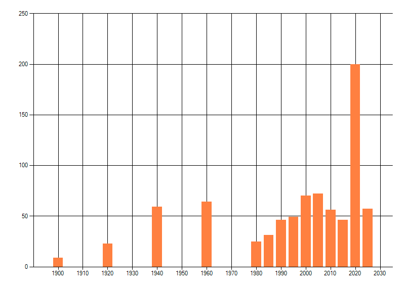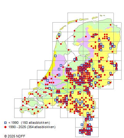 Het aantal atlasblokken (5x5 km) waarin de soort is gemeld binnen een periode van vijf jaar (vanaf 1980) of twintig jaar. Niet gecorrigeerd voor waarnemersinspanning en het aantal doorgegeven waarnemingen kan sterk variëren per periode, dus een trend in verspreiding kan hier niet direct uit worden afgelezen. Het opgegeven jaartal is het eerste jaar van de periode. Bron: gevalideerde waarnemingen uit de NDFF.
