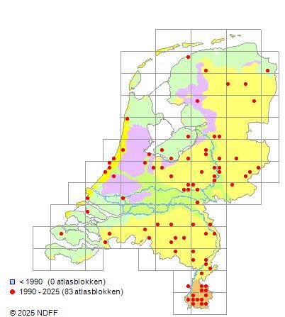 Het aantal atlasblokken (5x5 km) waarin de soort is gemeld binnen een periode van vijf jaar (vanaf 1980) of twintig jaar. Niet gecorrigeerd voor waarnemersinspanning en het aantal doorgegeven waarnemingen kan sterk variëren per periode, dus een trend in verspreiding kan hier niet direct uit worden afgelezen. Het opgegeven jaartal is het eerste jaar van de periode. Bron: gevalideerde waarnemingen uit de NDFF.