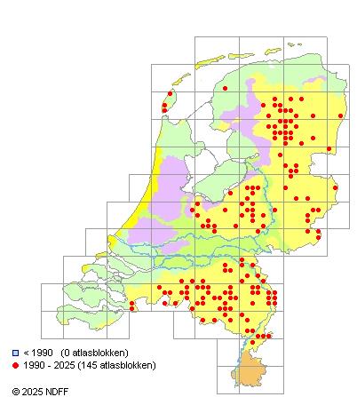 Het aantal atlasblokken (5x5 km) waarin de soort is gemeld binnen een periode van vijf jaar (vanaf 1980) of twintig jaar. Niet gecorrigeerd voor waarnemersinspanning en het aantal doorgegeven waarnemingen kan sterk variëren per periode, dus een trend in verspreiding kan hier niet direct uit worden afgelezen. Het opgegeven jaartal is het eerste jaar van de periode. Bron: gevalideerde waarnemingen uit de NDFF.