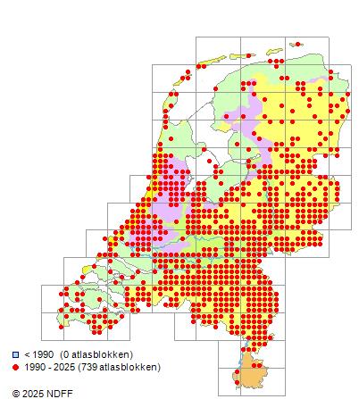Het aantal atlasblokken (5x5 km) waarin de soort is gemeld binnen een periode van vijf jaar (vanaf 1980) of twintig jaar. Niet gecorrigeerd voor waarnemersinspanning en het aantal doorgegeven waarnemingen kan sterk variëren per periode, dus een trend in verspreiding kan hier niet direct uit worden afgelezen. Het opgegeven jaartal is het eerste jaar van de periode. Bron: gevalideerde waarnemingen uit de NDFF.