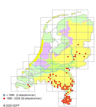 Het aantal atlasblokken (5x5 km) waarin de soort is gemeld binnen een periode van vijf jaar (vanaf 1980) of twintig jaar. Niet gecorrigeerd voor waarnemersinspanning en het aantal doorgegeven waarnemingen kan sterk variëren per periode, dus een trend in verspreiding kan hier niet direct uit worden afgelezen. Het opgegeven jaartal is het eerste jaar van de periode. Bron: gevalideerde waarnemingen uit de NDFF.