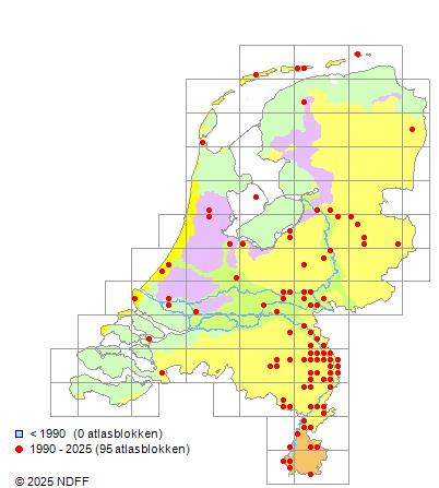 Het aantal atlasblokken (5x5 km) waarin de soort is gemeld binnen een periode van vijf jaar (vanaf 1980) of twintig jaar. Niet gecorrigeerd voor waarnemersinspanning en het aantal doorgegeven waarnemingen kan sterk variëren per periode, dus een trend in verspreiding kan hier niet direct uit worden afgelezen. Het opgegeven jaartal is het eerste jaar van de periode. Bron: gevalideerde waarnemingen uit de NDFF.