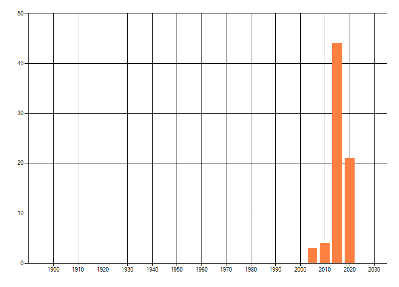 Het aantal atlasblokken (5x5 km) waarin de soort is gemeld binnen een periode van vijf jaar (vanaf 1980) of twintig jaar. Niet gecorrigeerd voor waarnemersinspanning en het aantal doorgegeven waarnemingen kan sterk variëren per periode, dus een trend in verspreiding kan hier niet direct uit worden afgelezen. Het opgegeven jaartal is het eerste jaar van de periode. Bron: gevalideerde waarnemingen uit de NDFF.