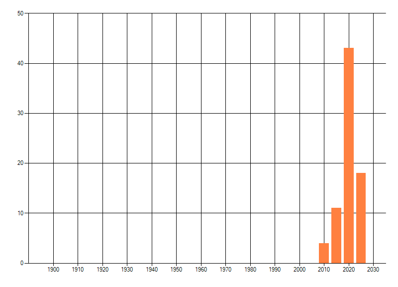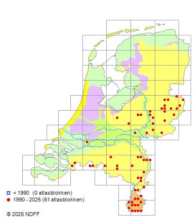 Het aantal atlasblokken (5x5 km) waarin de soort is gemeld binnen een periode van vijf jaar (vanaf 1980) of twintig jaar. Niet gecorrigeerd voor waarnemersinspanning en het aantal doorgegeven waarnemingen kan sterk variëren per periode, dus een trend in verspreiding kan hier niet direct uit worden afgelezen. Het opgegeven jaartal is het eerste jaar van de periode. Bron: gevalideerde waarnemingen uit de NDFF.