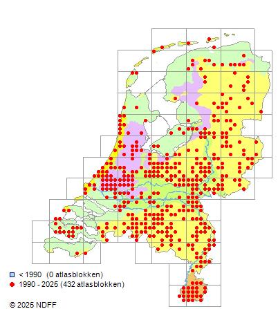 Het aantal atlasblokken (5x5 km) waarin de soort is gemeld binnen een periode van vijf jaar (vanaf 1980) of twintig jaar. Niet gecorrigeerd voor waarnemersinspanning en het aantal doorgegeven waarnemingen kan sterk variëren per periode, dus een trend in verspreiding kan hier niet direct uit worden afgelezen. Het opgegeven jaartal is het eerste jaar van de periode. Bron: gevalideerde waarnemingen uit de NDFF.