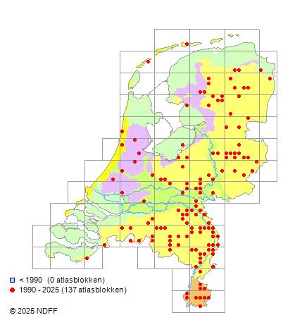 Het aantal atlasblokken (5x5 km) waarin de soort is gemeld binnen een periode van vijf jaar (vanaf 1980) of twintig jaar. Niet gecorrigeerd voor waarnemersinspanning en het aantal doorgegeven waarnemingen kan sterk variëren per periode, dus een trend in verspreiding kan hier niet direct uit worden afgelezen. Het opgegeven jaartal is het eerste jaar van de periode. Bron: gevalideerde waarnemingen uit de NDFF.
