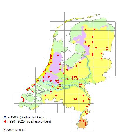 Het aantal atlasblokken (5x5 km) waarin de soort is gemeld binnen een periode van vijf jaar (vanaf 1980) of twintig jaar. Niet gecorrigeerd voor waarnemersinspanning en het aantal doorgegeven waarnemingen kan sterk variëren per periode, dus een trend in verspreiding kan hier niet direct uit worden afgelezen. Het opgegeven jaartal is het eerste jaar van de periode. Bron: gevalideerde waarnemingen uit de NDFF.