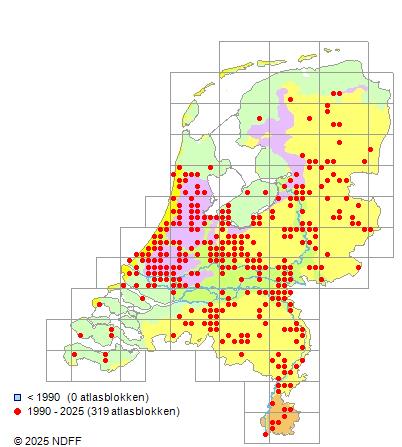 Het aantal atlasblokken (5x5 km) waarin de soort is gemeld binnen een periode van vijf jaar (vanaf 1980) of twintig jaar. Niet gecorrigeerd voor waarnemersinspanning en het aantal doorgegeven waarnemingen kan sterk variëren per periode, dus een trend in verspreiding kan hier niet direct uit worden afgelezen. Het opgegeven jaartal is het eerste jaar van de periode. Bron: gevalideerde waarnemingen uit de NDFF.