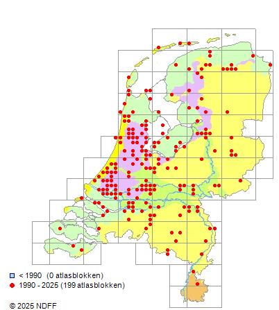 Het aantal atlasblokken (5x5 km) waarin de soort is gemeld binnen een periode van vijf jaar (vanaf 1980) of twintig jaar. Niet gecorrigeerd voor waarnemersinspanning en het aantal doorgegeven waarnemingen kan sterk variëren per periode, dus een trend in verspreiding kan hier niet direct uit worden afgelezen. Het opgegeven jaartal is het eerste jaar van de periode. Bron: gevalideerde waarnemingen uit de NDFF.