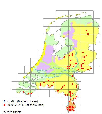 Het aantal atlasblokken (5x5 km) waarin de soort is gemeld binnen een periode van vijf jaar (vanaf 1980) of twintig jaar. Niet gecorrigeerd voor waarnemersinspanning en het aantal doorgegeven waarnemingen kan sterk variëren per periode, dus een trend in verspreiding kan hier niet direct uit worden afgelezen. Het opgegeven jaartal is het eerste jaar van de periode. Bron: gevalideerde waarnemingen uit de NDFF.