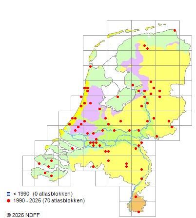 Het aantal atlasblokken (5x5 km) waarin de soort is gemeld binnen een periode van vijf jaar (vanaf 1980) of twintig jaar. Niet gecorrigeerd voor waarnemersinspanning en het aantal doorgegeven waarnemingen kan sterk variëren per periode, dus een trend in verspreiding kan hier niet direct uit worden afgelezen. Het opgegeven jaartal is het eerste jaar van de periode. Bron: gevalideerde waarnemingen uit de NDFF.