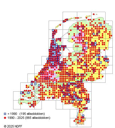 Het aantal atlasblokken (5x5 km) waarin de soort is gemeld binnen een periode van vijf jaar (vanaf 1980) of twintig jaar. Niet gecorrigeerd voor waarnemersinspanning en het aantal doorgegeven waarnemingen kan sterk variëren per periode, dus een trend in verspreiding kan hier niet direct uit worden afgelezen. Het opgegeven jaartal is het eerste jaar van de periode. Bron: gevalideerde waarnemingen uit de NDFF.