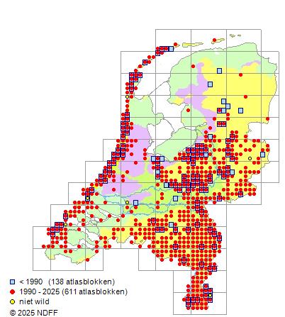 Het aantal atlasblokken (5x5 km) waarin de soort is gemeld binnen een periode van vijf jaar (vanaf 1980) of twintig jaar. Niet gecorrigeerd voor waarnemersinspanning en het aantal doorgegeven waarnemingen kan sterk variëren per periode, dus een trend in verspreiding kan hier niet direct uit worden afgelezen. Het opgegeven jaartal is het eerste jaar van de periode. Bron: gevalideerde waarnemingen uit de NDFF.