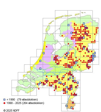 Het aantal atlasblokken (5x5 km) waarin de soort is gemeld binnen een periode van vijf jaar (vanaf 1980) of twintig jaar. Niet gecorrigeerd voor waarnemersinspanning en het aantal doorgegeven waarnemingen kan sterk variëren per periode, dus een trend in verspreiding kan hier niet direct uit worden afgelezen. Het opgegeven jaartal is het eerste jaar van de periode. Bron: gevalideerde waarnemingen uit de NDFF.