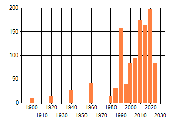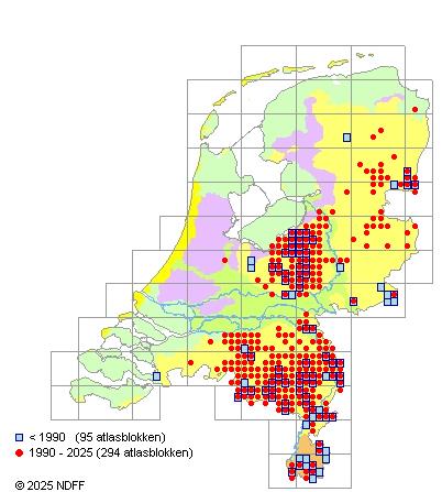 Het aantal atlasblokken (5x5 km) waarin de soort is gemeld binnen een periode van vijf jaar (vanaf 1980) of twintig jaar. Niet gecorrigeerd voor waarnemersinspanning en het aantal doorgegeven waarnemingen kan sterk variëren per periode, dus een trend in verspreiding kan hier niet direct uit worden afgelezen. Het opgegeven jaartal is het eerste jaar van de periode. Bron: gevalideerde waarnemingen uit de NDFF.