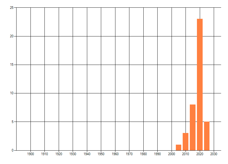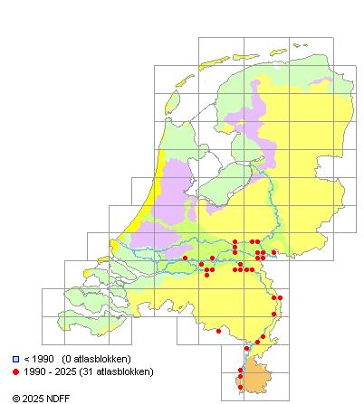 Het aantal atlasblokken (5x5 km) waarin de soort is gemeld binnen een periode van vijf jaar (vanaf 1980) of twintig jaar. Niet gecorrigeerd voor waarnemersinspanning en het aantal doorgegeven waarnemingen kan sterk variëren per periode, dus een trend in verspreiding kan hier niet direct uit worden afgelezen. Het opgegeven jaartal is het eerste jaar van de periode. Bron: gevalideerde waarnemingen uit de NDFF.