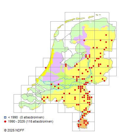Het aantal atlasblokken (5x5 km) waarin de soort is gemeld binnen een periode van vijf jaar (vanaf 1980) of twintig jaar. Niet gecorrigeerd voor waarnemersinspanning en het aantal doorgegeven waarnemingen kan sterk variëren per periode, dus een trend in verspreiding kan hier niet direct uit worden afgelezen. Het opgegeven jaartal is het eerste jaar van de periode. Bron: gevalideerde waarnemingen uit de NDFF.