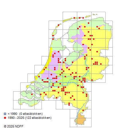 Het aantal atlasblokken (5x5 km) waarin de soort is gemeld binnen een periode van vijf jaar (vanaf 1980) of twintig jaar. Niet gecorrigeerd voor waarnemersinspanning en het aantal doorgegeven waarnemingen kan sterk variëren per periode, dus een trend in verspreiding kan hier niet direct uit worden afgelezen. Het opgegeven jaartal is het eerste jaar van de periode. Bron: gevalideerde waarnemingen uit de NDFF.