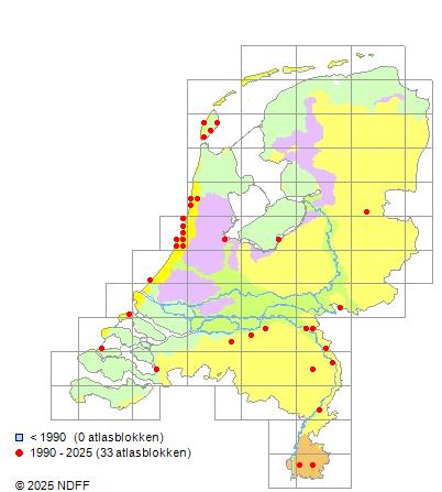 Het aantal atlasblokken (5x5 km) waarin de soort is gemeld binnen een periode van vijf jaar (vanaf 1980) of twintig jaar. Niet gecorrigeerd voor waarnemersinspanning en het aantal doorgegeven waarnemingen kan sterk variëren per periode, dus een trend in verspreiding kan hier niet direct uit worden afgelezen. Het opgegeven jaartal is het eerste jaar van de periode. Bron: gevalideerde waarnemingen uit de NDFF.